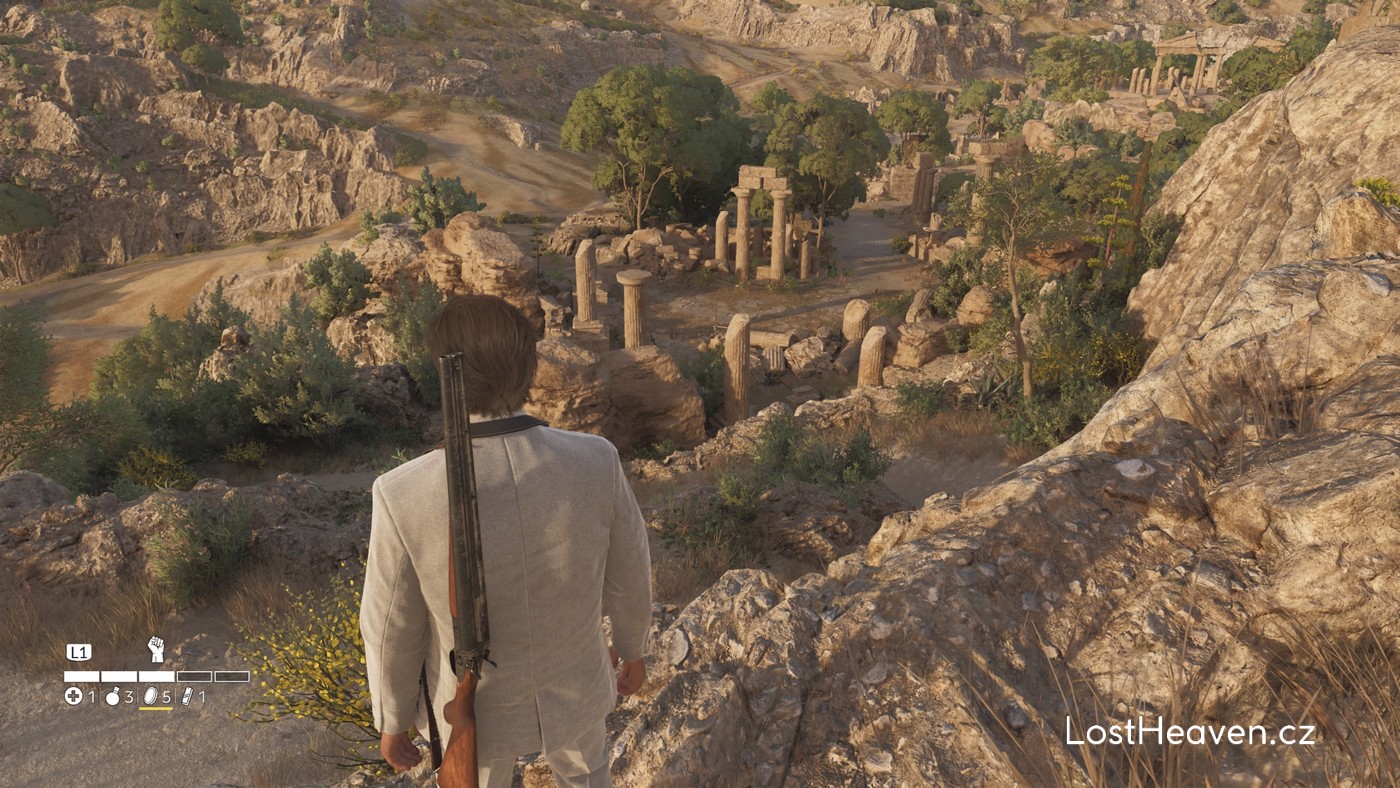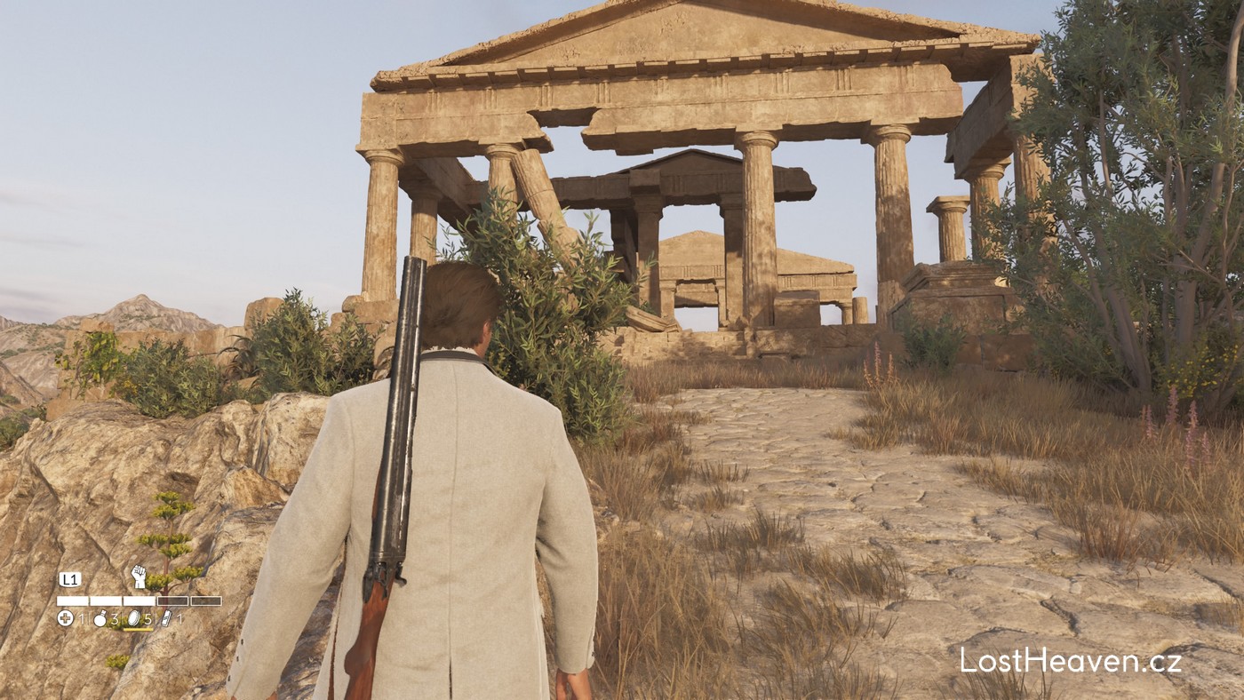 • V jedné z ruin se nachází křeslo, na jehož sedadle je gramofon.