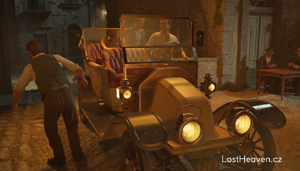 Enzo čeká venku v autě.
